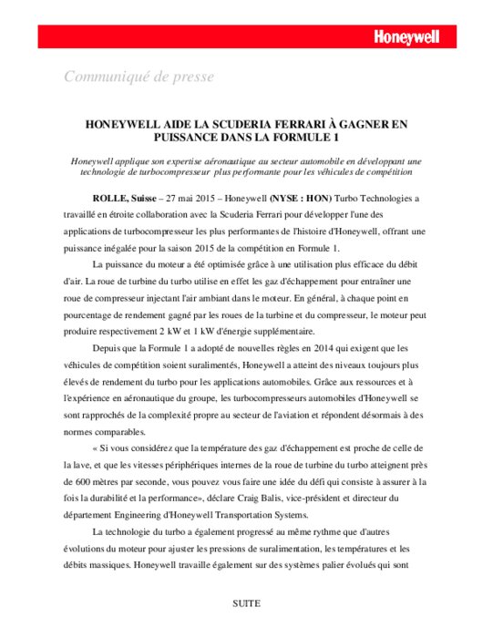 Honeywell applique son expertise aéronautique en compétition automobile. Honeywell équipe en particulier la Scuderia Ferrari, sur le podium du GP de Silverstone ce week-end. Un défi technologique quand on sait que la température des gaz d'échappement est proche de celle de la lave, et que les vitesses internes de la turbine du turbo atteignent près de 600 mètres par seconde !