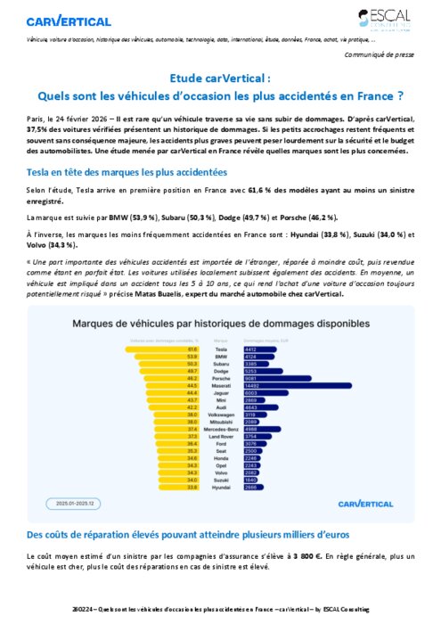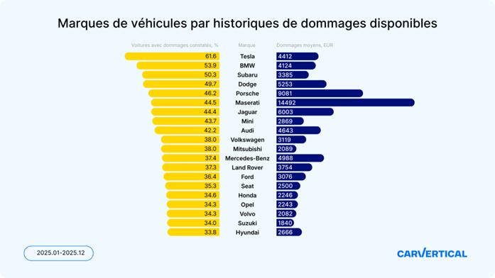 Il est rare qu’un véhicule traverse sa vie sans subir de dommages. D’après carVertical, 37,5% des voitures vérifiées présentent un historique de dommages. Si les petits accrochages restent fréquents et souvent sans conséquence majeure, les accidents plus graves peuvent peser lourdement sur la sécurité et le budget des automobilistes. Une étude menée par carVertical en France révèle quelles marques sont les plus concernées.