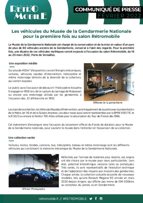 Le Musée de la Gendarmerie Nationale est chargé de la conservation et de la mise en valeur d’un parc de plus de 80 véhicules anciens de la Gendarmerie, conservé à l’abri des regards. Pour la première fois, une dizaine de ces véhicules mythiques seront exposés à l’occasion du salon Rétromobile, du 16 au 20 mars 2022, Porte de Versailles.