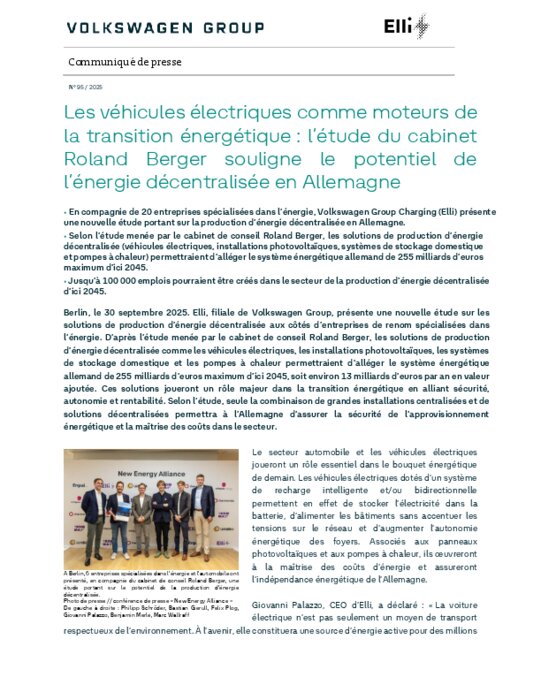 Elli, filiale de Volkswagen Group, présente une nouvelle étude sur les solutions de production d'énergie décentralisée aux côtés d'entreprises de renom spécialisées dans l'énergie. D'après l'étude menée par le cabinet de conseil Roland Berger, les solutions de production d'énergie décentralisée comme les véhicules électriques, les installations photovoltaïques, les systèmes de stockage domestique et les pompes à chaleur permettraient d'alléger le système énergétique allemand de 255 milliards d'euros maximum d'ici 2045, soit environ 13 milliards d'euros par an en valeur ajoutée.
