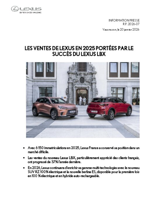 L’année 2025 de Lexus France a été marquée par le succès du nouveau Lexus LBX.Avec 3 141 immatriculations, ses ventes affichent une progression exceptionnelle de 37% par rapport à l’année précédente. Le Lexus LBX est le 3èmedes B-SUV Premium Hybride en France avec 33% de ce segment. C’est également le modèle Lexus le plus vendu aux particuliers.