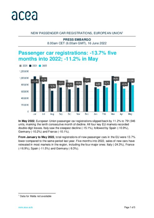 Avec 791.542 véhicules neufs vendus, en pleine pénurie de puces électroniques, c'est le plus faible mois de mai enregistré par l'ACEA depuis le début de la série statistique en 1990, hors le cas particulier de 2020 marqué par la pandémie de Covid-19.