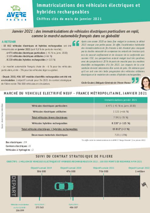 15 812 véhicules électriques et hybrides rechargeables ont été immatriculés en janvier 2021 (soit 9,8 % de parts de marché). Le marché automobile français chute de - 6 % pour les véhicules particuliers, et de - 3% pour les véhicules léger au global. Depuis 2010, 486 107 modèles électrifiés rechargeables ont été mis en circulation. L'objectif cumulé pour fin 2021 du contrat stratégique de filière est de 706 000 véhicules en circulation.