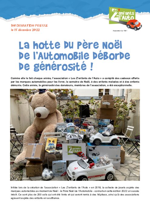 Comme elle le fait chaque année, l’association « Les Z’enfants de l’Auto » a compilé des cadeaux offerts par les marques automobiles pour les livrer, la semaine de Noël, à des enfants malades et à des enfants démunis. Cette année, la générosité des donateurs, membres de l’association, a été exceptionnelle.