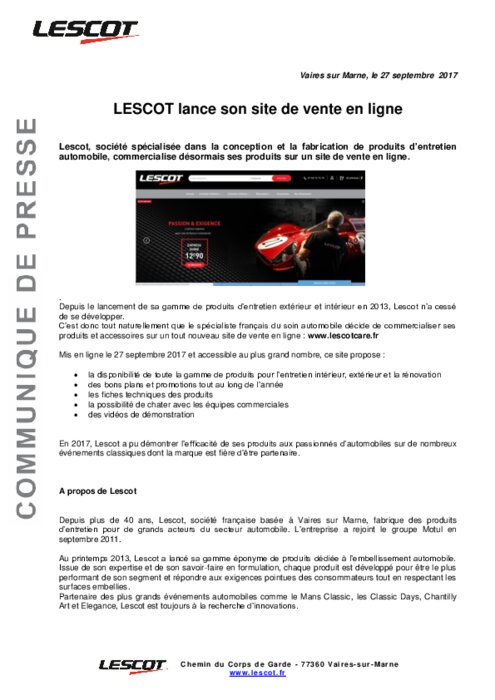 Lescot, société spécialisée dans la conception et la fabrication de produits d’entretien automobile, commercialise désormais ses produits sur un site de vente en ligne. Depuis le lancement de sa gamme de produits d’entretien extérieur et intérieur en 2013, Lescot n’a cessé de se développer. C’est donc tout naturellement que le spécialiste français du soin automobile décide de commercialiser ses produits et accessoires sur un tout nouveau site de vente en ligne : www.lescotcare.fr.
