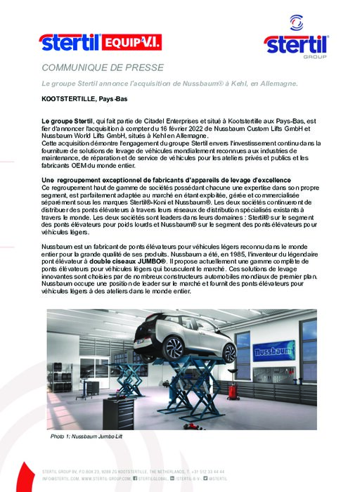 Equipementiers 22 février 2022 - 16:31 Le groupe Stertil, qui fait partie de Citadel Enterprises et situé à Kootstertille aux Pays-Bas, est fier d'annoncer l'acquisition à compter du 16 février 2022 de Nussbaum Custom Lifts GmbH et Nussbaum World Lifts GmbH, situés à Kehl en Allemagne. PDF (904 Ko) Télécharger