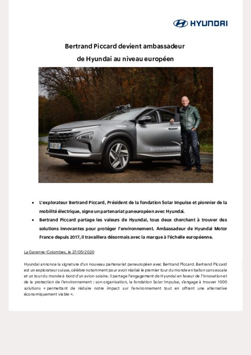 Hyundai annonce la signature d'un nouveau partenariat paneuropéen avec Bertrand Piccard. Bertrand Piccard est un explorateur suisse, célèbre notamment pour avoir réalisé le premier tour du monde en ballon sans escale et un tour du monde à bord d'un avion solaire. Il partage l’engagement de Hyundai en faveur de l’innovation et de la protection de l’environnement...