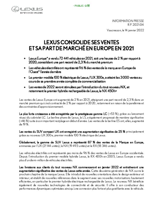 Lexus Europe a vendu 72 441 véhicules en 2021, soit une hausse de 2 % par rapport à 2020, consolidant une part record de 2,3 % du marché premium. Les véhicules électrifiés ont représenté 96 % des ventes de la marque en Europe de l'Ouest l'année dernière. Le premier modèle 100 % électrique de Lexus, l'UX 300e, a atteint les 3 000 ventes au cours de sa première année complète de commercialisation. Les ventes de 2022 seront stimulées par l'introduction du tout nouveau NX...