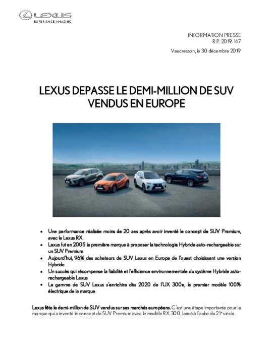 Lexus fête le demi-million de SUV vendus sur ses marchés européens. C’est une étape importante pour la marque qui a inventé le concept de SUV Premium avec le modèle RX 300, lancé à l’aube du 21e siècle. Les chiffres des ventes cumulées à fin novembre 2019 indiquent que plus de 501 000 SUV Lexus ont été commercialisés en Europe depuis l’introduction du RX en 2000. Le RX, actuellement dans sa 4e génération, reste le SUV Lexus le plus vendu en Europe, avec un cumul de presque 275 000 unités...