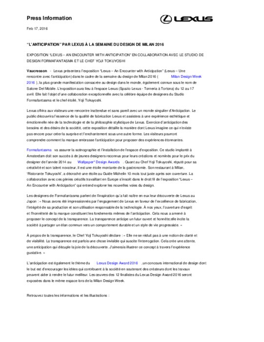 Lexus présentera l’exposition “Lexus – An Encounter with Anticipation” (Lexus – Une rencontre avec l’anticipation) dans le cadre de la semaine du design de Milan 2016 ( Milan Design Week 2016 ), la plus grande manifestation consacrée au design dans le monde, également connue sous le nom de Salone Del Mobile. L’exposition aura lieu à l’espace Lexus (Spazio Lexus - Torneria à Tortona) du 12 au 17 avril.