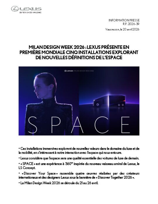 L'exposition Lexus à la Milan Design Week 2026 se tient au Superstudio Più dans le quartier de Tortona à Milan jusqu'au dimanche 26 avril. Depuis sa création, Lexus n’a cessé d’explorer les voies permettant d’offrir à ses clients de nouvelles valeurs et expériences, tant à travers ses véhicules que ses services. Forte de cet engagement dans l’innovation, la Marque a toujours été prête à remettre en question les conventions traditionnelles du luxe.
