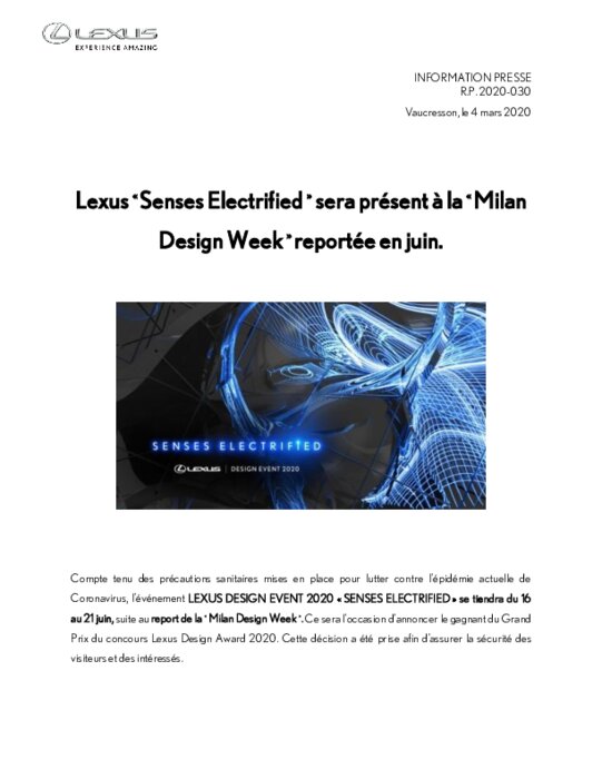 Compte tenu des précautions sanitaires mises en place pour lutter contre l'épidémie actuelle de Coronavirus, l'événement LEXUS DESIGN EVENT 2020 " SENSES ELECTRIFIED " se tiendra du 16 au 21 juin, suite au report de la " Milan Design Week ". Ce sera l'occasion d'annoncer le gagnant du Grand Prix du concours Lexus Design Award 2020. Cette décision a été prise afin d'assurer la sécurité des visiteurs et des intéressés.
