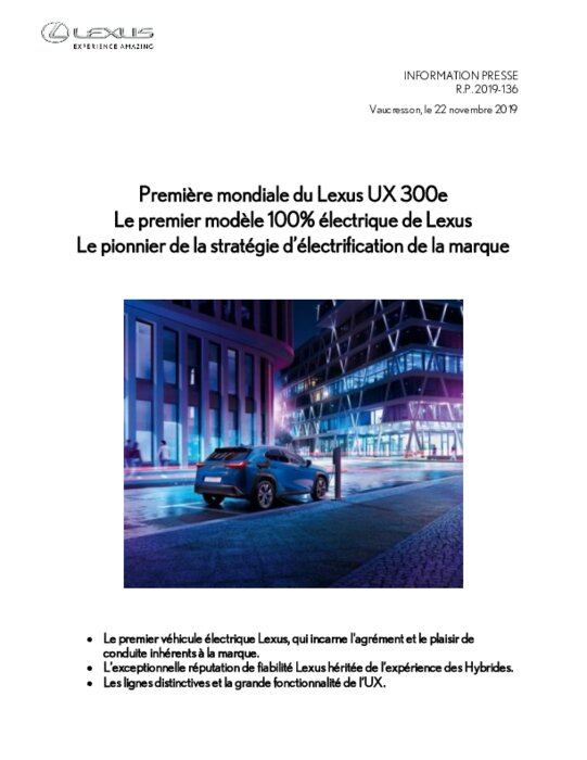 Lexus dévoile son premier véhicule électrique à batterie (BEV), l'UX 300e, au salon international de l'automobile de Canton (Guangzhou), en Chine, qui se tient du 22 novembre au 1er décembre 2019. Depuis l'introduction du RX 400h en 2005, Lexus est un pionnier des technologies d'électrification et montre la voie en offrant des véhicules à la fois performants et respectueux de l'environnement...