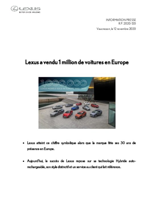 Lexus a franchi le cap symbolique du million de véhicules vendus en Europe en septembre dernier. Un moment fort de l'histoire de la marque qui coïncide avec le 30e anniversaire de son lancement sur le continent et l'introduction de son premier modèle 100% électrique, l’UX 300e.