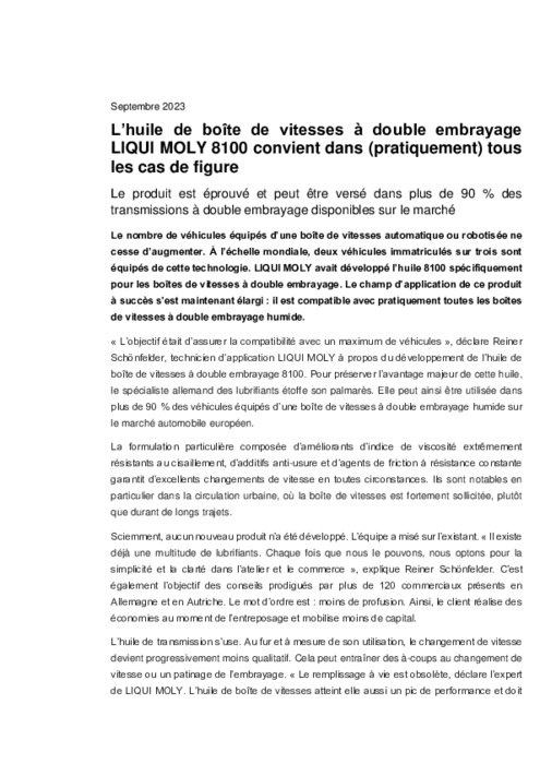 Equipementiers 12 septembre 2023 - 11:18 Le produit est éprouvé et peut être versé dans plus de 90 % des transmissions à double embrayage disponibles sur le marché. PDF (135 Ko) Télécharger