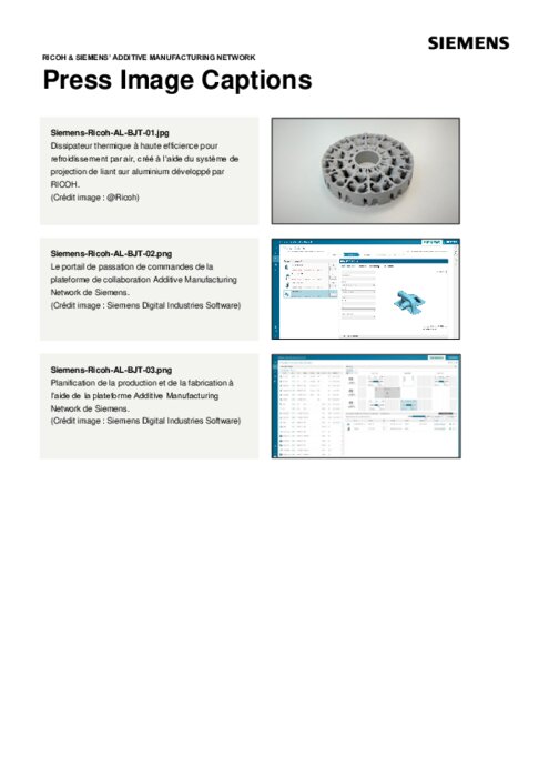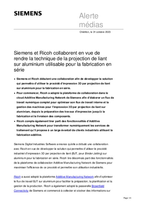 Equipementiers 31 octobre 2023 - 14:17 Siemens et Ricoh débutent une collaboration afin de développer la solution qui permettra d’utiliser le procédé d’impression 3D par projection de liant sur aluminium pour la fabrication en série. PDF (123 Ko) Télécharger PDF (227 Ko) Télécharger