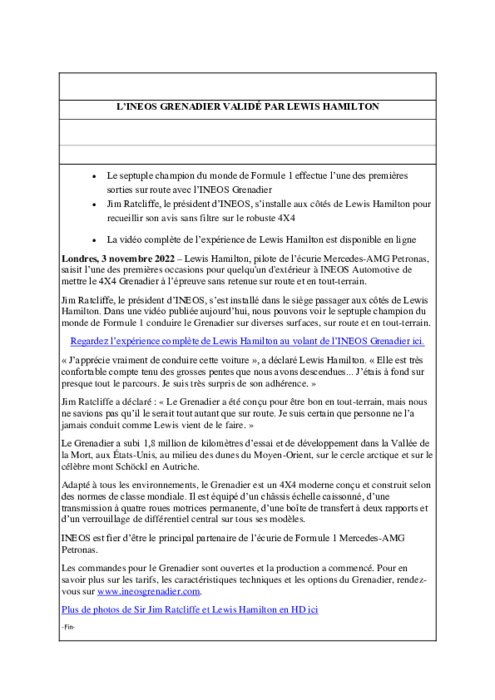 Constructeurs 04 novembre 2022 - 14:00 Lewis Hamilton, pilote de l’écurie Mercedes-AMG Petronas, saisit l’une des premières occasions pour quelqu'un d'extérieur à INEOS Automotive de mettre le 4X4 Grenadier à l’épreuve sans retenue sur route et en tout-terrain. PDF (225 Ko) Télécharger
