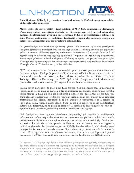 Link Motion et MTA SpA annoncent le démarrage d’une coopération stratégique destinée au développement et à la réalisation d’un système d’Infotainment avec une unité centrale MTA et une plateforme software de Link Motion optimisées et évolutives. L’objectif : fournir des solutions complètes, intégrées et abordables aux constructeurs automobiles.