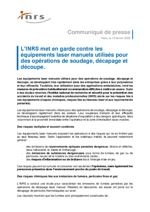 Les équipements laser manuels utilisés pour des opérations de soudage, décapage et découpe, se développent très rapidement dans les entreprises grâce à leur polyvalence et leur efficacité. Toutefois, leur utilisation pour des applications ambulatoires, rend les mesures de prévention habituellement recommandées difficiles à mettre en œuvre. Suite à des études récentes, l’Institut national de recherche et sécurité pour la prévention des accidents du travail et des maladies professionnelles (INRS) alerte sur les risques liés à ces équipements (risques chimiques, risques liés au faisceau laser et aux rayonnements parasites).