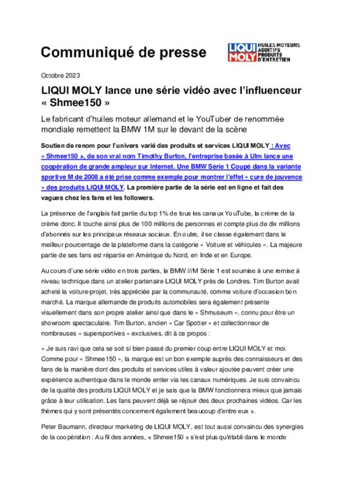 Avec « Shmee150 », de son vrai nom Timothy Burton, l’entreprise basée à Ulm lance une coopération de grande ampleur sur Internet. Une BMW Série 1 Coupé dans la variante sportive M de 2008 a été prise comme exemple pour montrer l'effet « cure de jouvence » des produits LIQUI MOLY.