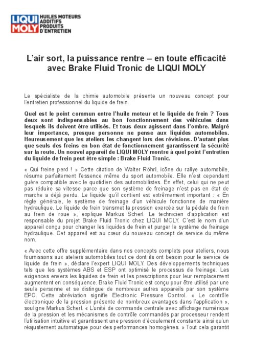 Quel est le point commun entre l’huile moteur et le liquide de frein? Tous deux sont indispensables au bon fonctionnement des véhicules dans lesquels ils doivent être utilisés. Et tous deux agissent dans l’ombre. Malgré leur importance, presque personne ne pense aux liquides automobiles. Heureusement que les ateliers les changent lors des révisions. D’autant plus que seuls des freins en bon état de fonctionnement garantissent la sécurité sur la route. Un nouvel appareil de Liqui Moly montre à quel point l’entretien du liquide de frein peut être simple : Brake Fluid Tronic.