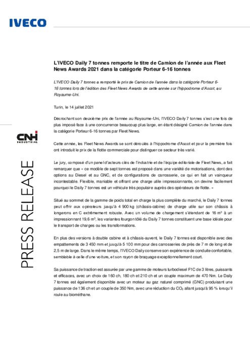 Constructeurs 20 juillet 2021 - 09:00 L’IVECO Daily 7 tonnes a remporté le prix de Camion de l’année dans la catégorie Porteur 616 tonnes lors de l’édition des Fleet News Awards de cette année sur l’hippodrome d’Ascot, au Royaume-Uni. PDF (148 Ko) Télécharger