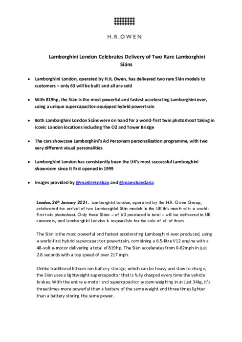 Lamborghini London, exploité par le groupe H.R. Owen, a célébré l’arrivée de deux modèles Lamborghini Sián au Royaume-Uni ce mois-ci avec une première mondiale photoshootée. Seuls trois Siáns – sur 63 produits au total – seront livrés à des clients britanniques, et Lamborghini London est en charge de la vente de tous ces produits.