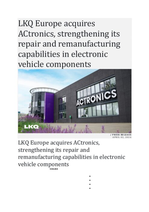 Distributeurs 03 avril 2026 - 17:33 Zoug, Suisse. LKQ Europe a annoncé aujourd'hui l'acquisition d'ACtronics, un spécialiste européen de premier plan dans la réparation et la remise à neuf de composants électroniques automobiles. PDF (4 Mo) Télécharger