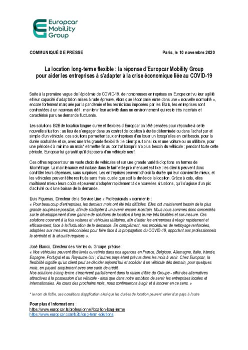 Suite à l'épidémie de COVID-19 et à la demande croissante de nombreuses entreprises en Europe de services toujours plus agiles, Europcar propose des solutions B2B de location longue durée et flexibles. Europcar offre ainsi la possibilité à l'entreprise cliente de louer une voiture ou un utilitaire pour une période d'a minima un mois et mettre fin au contrat lorsqu'elle n'a plus besoin du véhicule. Ces solutions s'inscrivent dans la raison d'être du groupe : offrir des alternatives attractives...