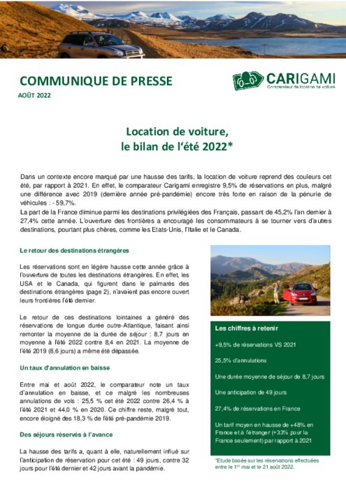 Dans un contexte encore marqué par une hausse des tarifs, la location de voiture reprend des couleurs cet été, par rapport à 2021. En effet, le comparateur Carigami enregistre 9,5% de réservations en plus, malgré une différence avec 2019 (dernière année pré-pandémie) encore très forte en raison de la pénurie de véhicules : - 59,7%.