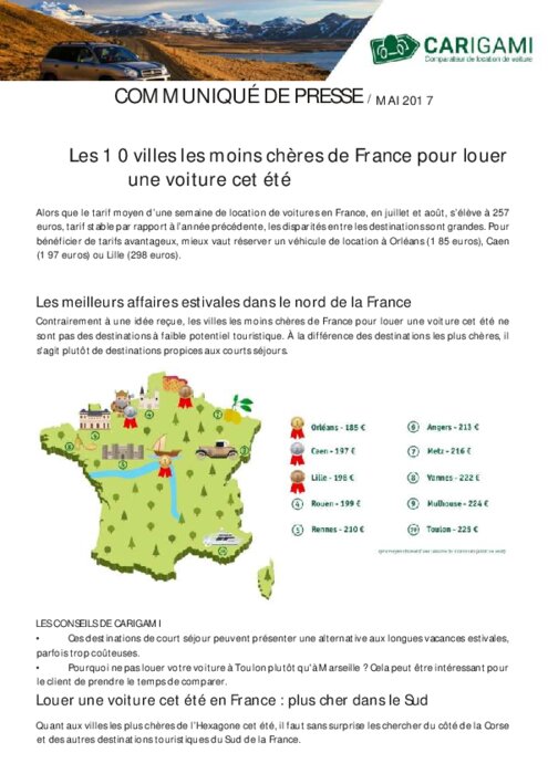 Alors que le tarif moyen d’une semaine de location de voitures en France, en juillet et août, s’élève à 257 euros, tarif stable par rapport à l’année précédente, les disparités entre les destinations sont grandes. Pour bénéficier de tarifs avantageux, mieux vaut réserver un véhicule de location à Orléans (1 85 euros), Caen (1 97 euros) ou Lille (298 euros).