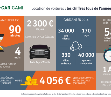 Services 18 janvier 2017 - 16:57 Une image vaut mieux qu’un grand discours. Voici donc, en un coup d’œil, toutes les chiffres essentiels et insolites à retenir de l’année 2016 de Carigami !
