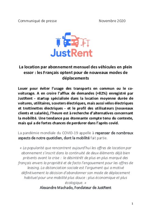Louer pour éviter l'usage des transports en commun ou le co-voiturage. A en croire l'afflux de demandes (+82%) enregistré par JustRent - startup spécialisée dans la location moyenne durée de voitures, utilitaires, scooters électriques, mais aussi vélos électriques et trottinettes électriques - et le profil des utilisateurs (nouveaux clients et salariés), l'heure est à recherche d'alternatives concernant la mobilité...