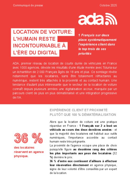 ADA, premier réseau de location de courte durée de véhicules en France avec 1000 agences, dévoile les résultats d'une étude menée avec Toluna sur un échantillon de 2 000 Français âgés de 18 ans et plus. Ce sondage révèle