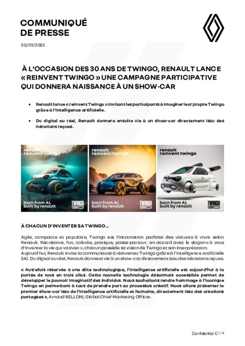 Agile, compacte et populaire, Twingo est l’incarnation parfaite des voitures à vivre selon Renault. Récréative, fun, colorée, pratique, passe-partout : en accord avec le slogan « à vous d’inventer la vie qui va avec », chacun possède sa vision de Twingo et son interprétation. Aujourd’hui, Renault invite la communauté à réinventer Twingo grâce à l’intelligence artificielle (IA). Du digital au réel, Renault donnera vie à un show-car directement issu des itérations reçues.