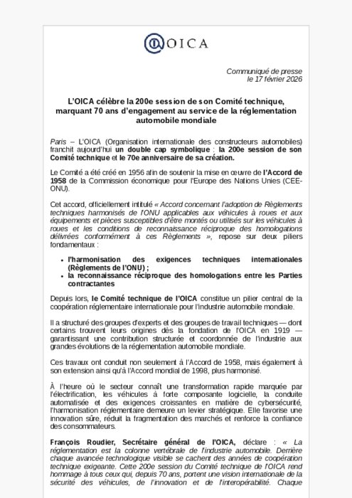 L’OICA (Organisation internationale des constructeurs automobiles) franchit aujourd’hui un double cap symbolique: la 200e session de son Comité technique et le 70e anniversaire de sa création. Le Comité a été créé en 1956 afin de soutenir la mise en œuvre de l’Accord de 1958de la Commission économique pour l'Europe des Nations Unies (CEE-ONU).