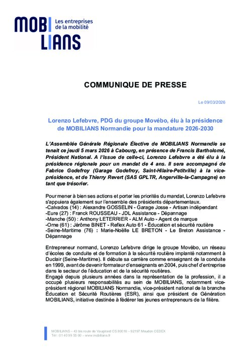 L’Assemblée Générale Régionale Élective de MOBILIANS Normandie se tenait ce jeudi 5 mars 2026 à Cabourg, en présence de Francis Bartholomé, Président National. A l’issue de celle-ci, Lorenzo Lefebvre a été élu à la présidence régionale pour un mandat de 4 ans. Il sera accompagné de Fabrice Godefroy (Garage Godefroy, Saint-Hilaire-Petitville) à la vice-présidence, et de Thierry Revert (SAS GPLTR, Angerville-la-Campagne) en tant que trésorier.