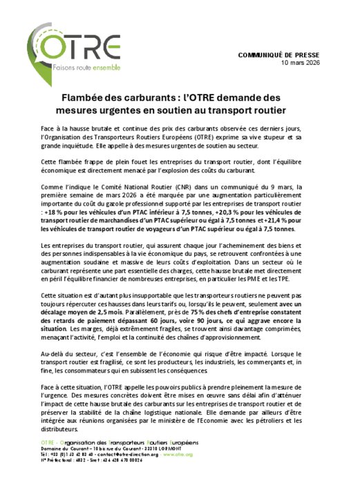 Face à la hausse brutale et continue des prix des carburants observée ces derniers jours, l’Organisation des Transporteurs Routiers Européens (OTRE) exprime sa vive stupeur et sa grande inquiétude. Elle appelle à des mesures urgentes de soutien au secteur.