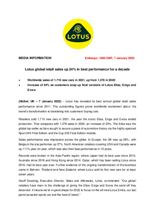 Lotus a révélé sa meilleure performance annuelle de ventes au détail mondiales depuis 2011. Ces chiffres exceptionnels prouvent que l'enthousiasme mondial suscité par la transformation de la marque se traduit par l'achat de voitures par les clients. Les détaillants ont vendu 1 710 voitures neuves en 2021, année où la production des emblématiques Elise, Exige et Evora a pris fin. Ce chiffre est à comparer aux 1 378 ventes réalisées en 2020, soit une augmentation de 24 %...