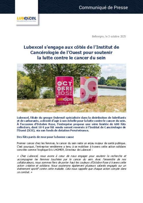 Lubexcel, filiale du groupe Dubreuil spécialisée dans la distribution de lubrifiants et de carburants, a décidé d’agir à son échelle pour la lutte contre le cancer du sein. À l’occasion d’Octobre Rose, l’entreprise propose une série limitée de 600 fûts collectors, dont 10 € par fût vendu seront reversés à l’Institut de Cancérologie de l’Ouest (ICO), via son fonds de dotation Persévérance.
