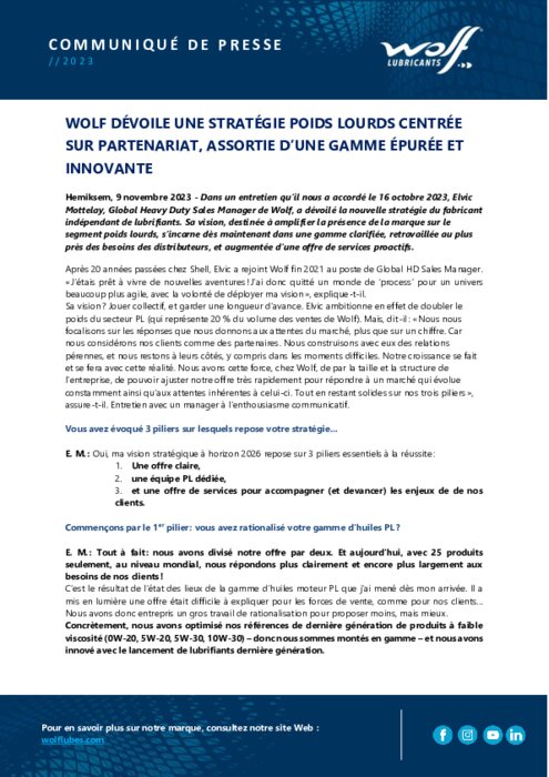 Equipementiers 08 novembre 2023 - 11:49 A l’aube de Solutrans, Elvic Mottelay, Global Heavy Duty Sales Manager de Wolf, dévoile la nouvelle stratégie du fabricant indépendant de lubrifiants. PDF (243 Ko) Télécharger