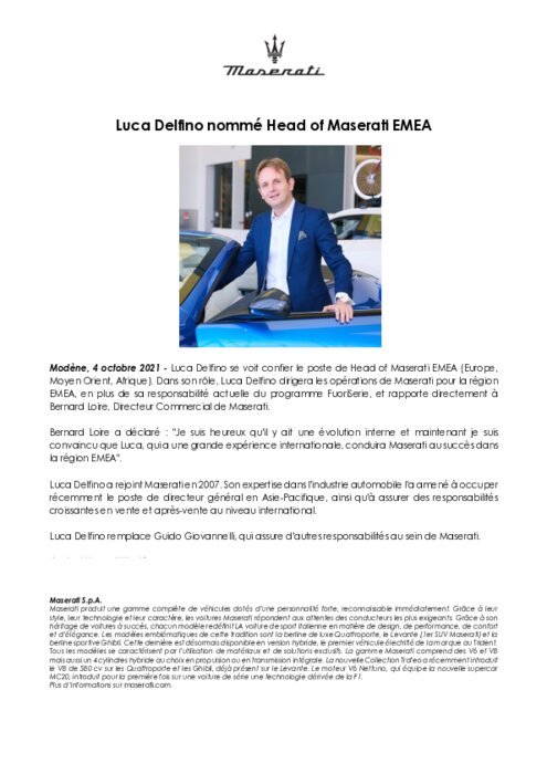 Luca Delfino se voit confier le poste de Head of Maserati EMEA (Europe, Moyen Orient, Afrique). Dans son rôle, Luca Delfino dirigera les opérations de Maserati pour la région EMEA, en plus de sa responsabilité actuelle du programme FuoriSerie, et rapporte directement à Bernard Loire, Directeur Commercial de Maserati...