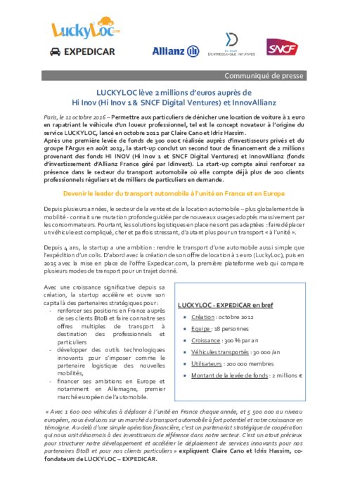 Permettre aux particuliers de dénicher une location de voiture à 1 euro en rapatriant le véhicule d'un loueur professionnel, tel est le concept novateur à l'origine du service LUCKYLOC, lancé en octobre 2012 par Claire Cano et Idris Hassim. Après une première levée de fonds de 300 000€ réalisée auprès d'investisseurs privés et du groupe l'Argus en août 2013, la start-up conclut un second tour de financement de 2 millions provenant des fonds HI INOV et et InnovAllianz.