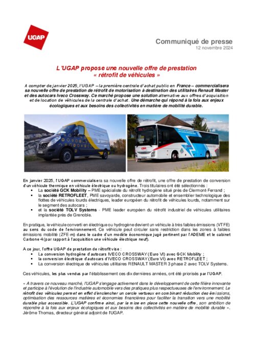 A compter de janvier 2025, l’UGAP – la première centrale d’achat public en France – commercialisera sa nouvelle offre de prestation de rétrofit de motorisation à destination des utilitaires Renault Master et des autocars Iveco Crossway. Ce marché propose une solution alternative aux offres d’acquisition et de location de véhicules de la centrale d’achat. Une démarche qui répond à la fois aux enjeux écologiques et aux besoins des collectivités en matière de mobilité durable.