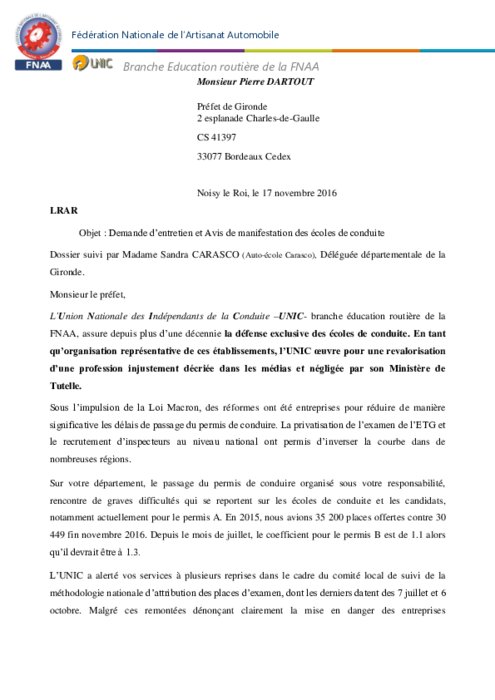 Services 18 novembre 2016 - 14:43 L’UNIC (Union Nationale des Indépendants de la Conduite) branche éducation routière de la FNAA, vient de lancer un appel à manifester à l’ensemble des écoles de conduite implantées en Gironde pour le 28 novembre prochain. PDF (250 Ko) Télécharger PDF (339 Ko) Télécharger