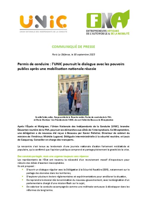Après l’Élysée et Matignon, l’Union Nationale des Indépendants de la Conduite (UNIC), branche Éducation routière de la FNA, poursuit ses démarches aux côtés de l’intersyndicale. Ce 30 septembre, une délégation a de nouveau été reçue à Beauvau par Xavier Pelletier, Directeur de cabinet du ministre de l’Intérieur, Michèle Lugrand, Déléguée interministérielle à la sécurité routière, et Louis de Cacqueray, Conseiller en charge des transports.