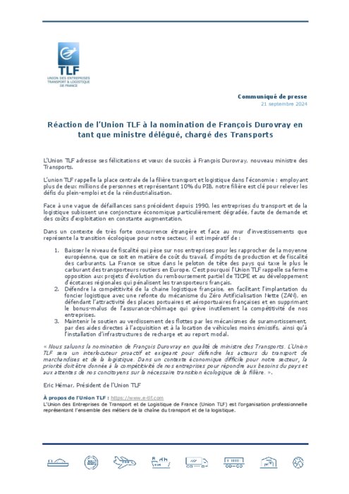 L’Union TLF adresse ses félicitations et vœux de succès à François Durovray, nouveau ministre des Transports. L’union TLF rappelle la place centrale de la filière transport et logistique dans l’économie : employant plus de deux millions de personnes et représentant 10% du PIB, notre filière est clé pour relever les défis du plein-emploi et de la réindustrialisation.