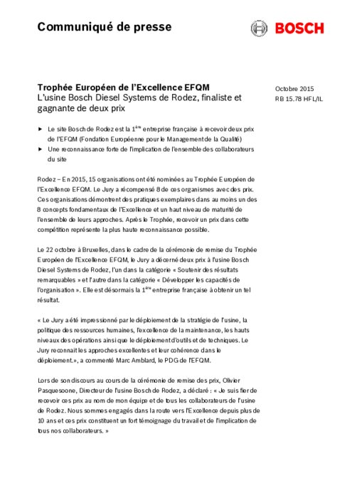 Le 22 octobre à Bruxelles, dans le cadre de la cérémonie de remise du Trophée Européen de l’Excellence EFQM, le Jury a décerné deux prix à l’usine Bosch Diesel Systems de Rodez, l’un dans la catégorie « Soutenir des résultats remarquables » et l’autre dans la catégorie « Développer les capacités de l’organisation ». Elle est désormais la 1ère entreprise française à obtenir un tel résultat.