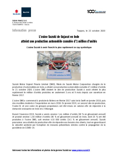 Suzuki Motor Gujarat Private Limited (SMG), filiale de Suzuki Motor Corporation chargée de la production d’automobiles en Inde, a atteint une production automobile cumulée d’1 million d’unités le 21 octobre 2020. L’usine SMG devient le site de production Suzuki à avoir atteint le plus rapidement le million d’unités produites en seulement 3 ans et 9 mois depuis son ouverture en février 2017.