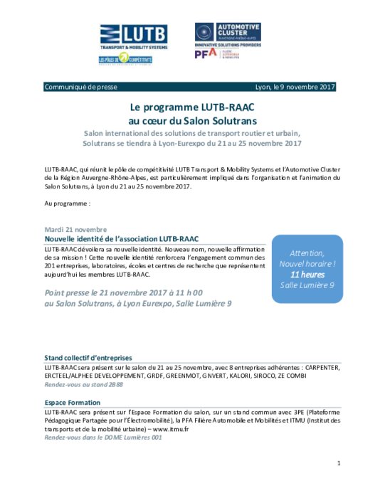 LUTB-RAAC, qui réunit le pôle de compétitivité LUTB Transport & Mobility Systems et l'Automotive Cluster de la Région Auvergne-Rhône-Alpes, est particulièrement impliqué dans l'organisation et l'animation du Salon Solutrans, à Lyon du 21 au 25 novembre 2017.
